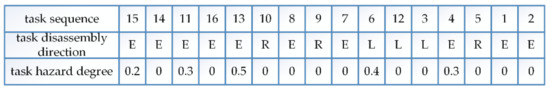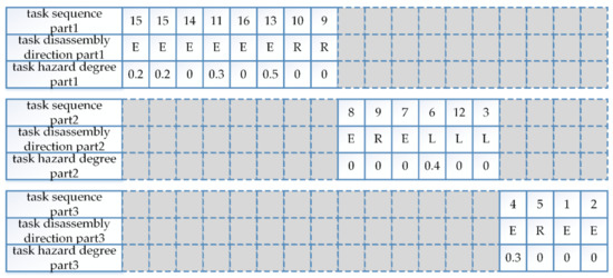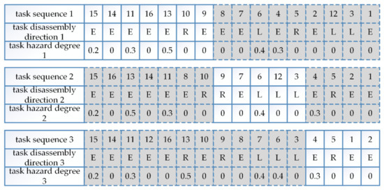 Tasks with higher hazard degrees and later to be disassembled will consume more added energy; therefore, in the regeneration, priority should be given to removing high-hazard tasks to reduce the energy consumption, and meanwhile, the convergence can be accelerated to prevent the random search of solution space. Figure 8 depicts the full state of the three split disassembly task sequence segments after regeneration. Taking the regeneration process based on the intermediate segment as an example, first, it can be found that all tasks in the fragment are unique, and the lost task set is {1,2,4,5,8,10,11,13,14,15,16}; then, according to the disassembly precedence relationship, tasks 16, 15 and 14 can be the first candidate task in the new regenerated task sequence, and task 15 is selected since it has a hazard degree of 0.5 unit, then task 16 is randomly identified as the second, when tasks 14, 13, and 11 become available, task 13 is selected based on the same principle of hazard degree priority. Other lost disassembly tasks are selected into the new regenerated task sequence similarly.
