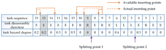 Figure 6 depicts the growth process of P16. Here, the growth probability is set to 0.1, then 2 of the 16 disassembly tasks will be randomly selected for growth. Assuming that tasks 9 and 15 are selected separately, then the available positions of task 9 can be inserted only to the immediate left of task 9 or 8 or 10, according to the disassembly precedence relationship of the tasks, assuming that the actual insertion position is to the immediate left of task 8. In the same way, the actual insertion position of task 15 is fixed to the immediate left of task 14. At this time, the disassembly task sequence is no longer feasible because of the existence of redundant tasks, but it is prepared for the next splitting process.
