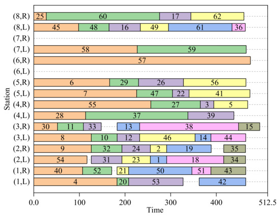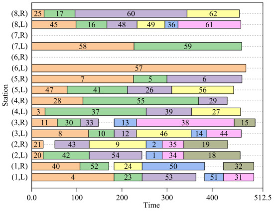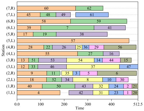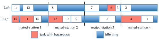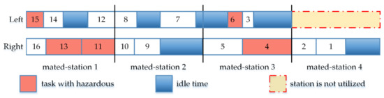 Three Pareto-optimal disassembly schemes of the proposed MOFA are depicted in Figure 14, Figure 15 and Figure 16. First of all, both the minimum BLR and minimum SI schemes need to open 8 mated-stations, and in which 2 stations are not opened, while in the minimum TEC scheme only needs to open 7 mated-stations and each workstation is fully utilized. Secondly, the task pairs requiring parallel disassembly on both sides are satisfied, in the minimum BLR and minimum SI schemes; those operations are mainly completed on mated-station 2, while in the minimum TEC scheme are mainly operated on mated-station 1. Finally, the BLR of the minimum BLR and minimum SI schemes is 6.51%, and the SI and TEC are 32,678.75; 11,313.75 and 33,045.25; 11,310.41, respectively. While the minimum TEC scheme only needs 10,908.77 owning to the less energy consumption of lighting and ventilation by opening the fewer mated-stations. More importantly, the minimum TEC scheme can complete all hazardous tasks except task 7 before mated-station 4, which reduces the additional energy consumption needed to deal with hazardous tasks, while the remaining two schemes can only complete most of the hazardous tasks before mated-station 5. However, it should be noted that the minimum TEC scheme leads to higher BLR and SI, which are 12.72% and 144,200.75, respectively.