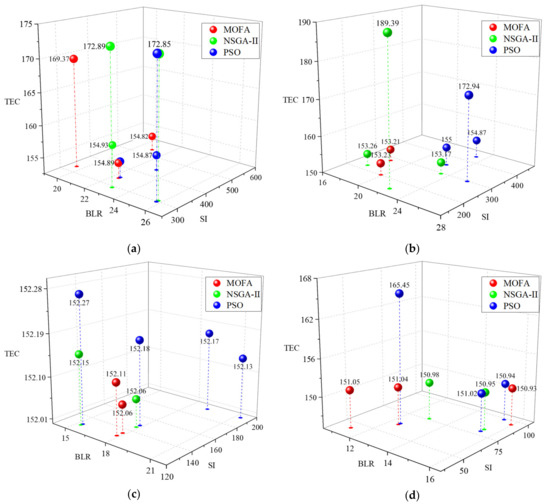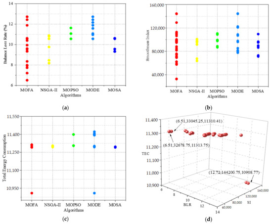 It is clear from Figure 13 that the Pareto-optimal solutions obtained by MOFA can obtain a better distribution on any objective than other algorithms. Although the line balance loss rate (BLR) and smoothness index (SI) in Figure 13a,b are relatively higher, referring to Figure 13d, it can be seen that the corresponding energy consumption is relatively lower.