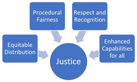 - Capacities, or capabilities, is credited to separate works of Sen [36,37] and Nussbaum [38,39]. It encapsulates the three previous approaches but goes further in not simply seeking some form of fair dispute resolution. It has positive aims to improve the lives of living things. Its essence is that for justice, an individual must be enabled to have access to assets they need not just to survive, but to thrive. It can include the equitable distribution among us to achieve this, and how we participate and engage with due process and respect for those needs to be articulated and heard. It then goes further by addressing quality of life and well-being, by setting minimum standards that need to be achieved [22]. (For an example of the application of capability justice in infrastructure in practice, see [8]).