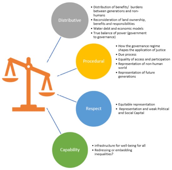 In defining and applying concepts of justice, reliance here is placed on Schlosberg’s widely cited work on environmental justice [22]. The reason for selection of this work is its comprehensive review of justice themes relevant to the tensions in governance of natural resources, such as water, and its interface with humanity [23,24,25]. It is a work that, through its breaking down of the concept of justice, enables it to be understood and applied to different contexts. The association with the concept of ‘just sustainability’ is also significant [26,27], the addition of the word ‘just’ expressly accepting in some way that sustainability alone is not ‘enough’. The discussion draws on bodies of work around justice to include different forms of justice—distributive, procedural, recognition (or respect), and ‘capacities’ (or capabilities), all of which can interconnect [22].