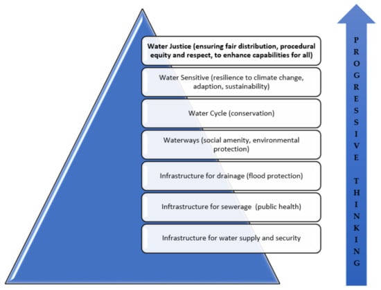 Strang therefore addresses justice directly, but justice themes are also evident more diffusely through the work in issues of access to the governance system (participation) and the allocation of benefits and burdens (distribution), be those human-to-human or human-to-ecosystem [45]. It also highlights the importance of the governance regime in shaping roles and attitudes to water and infrastructure, and so where tensions with justice may arise.