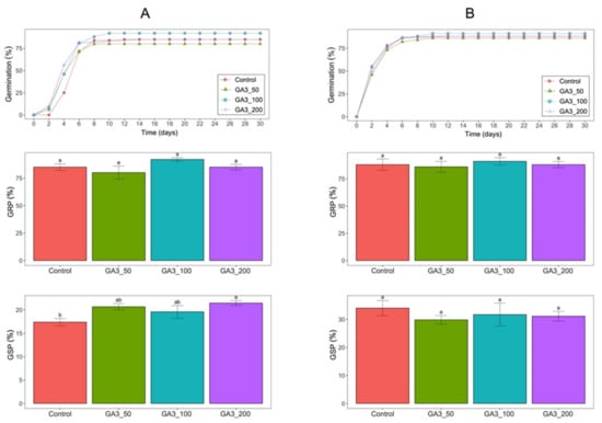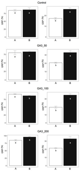 GRP and GSP comparison of wild (A) and cultivated (B) seeds of A. montana for each treatment: Control, water; GA3_50, 50 mg L−1 solution of GA3; GA3_100, 100 mg L−1 solution of GA3; GA3_200, 200 mg L−1 solution of GA3. Different letters in the bars indicate significant differences (p < 0.05) among treatments returned by t-test.
