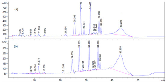 Comparison of HPLC profile of the crude lactones fraction: (a) wild arnica; (b) cultivated arnica.