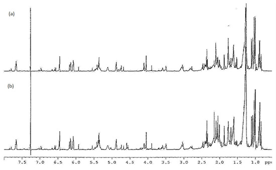 Comparison of 1H NMR spectrum of the crude lactones fraction: (a) wild arnica; (b) cultivated arnica.