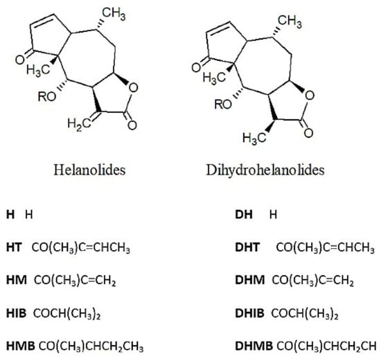 - Beekman, A.C.; Woerdenbag, H.J.; van Uden, W.; Pras, N.; Konings, A.W.; Wikström, H.V.; Schmidt, T.J. Structure-cytotoxicity relationships of some helenanolide-type sesquiterpene lactones. J. Nat. Prod. 1997, 60, 252–257. [Google Scholar] [CrossRef]