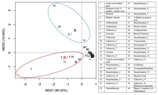 MDS biplot of VOCs in a significatively different quantity in wild and cultivated arnica. The blue cross and the red cross indicate wild (A) and cultivated arnica (B) respectively. The compounds that characterize wild arnica and those that characterize commercial arnica are highlighted with blue and red ellipses, respectively. Numeric codes refer to the compound shown in the table.