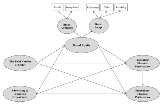 For reducing potential conflict of interests and achieve a win-win result, recent research has emphasized the importance of building a franchisor–franchisee relationship based upon brand equity [9]. In this line of research, it is suggested that the two parties—the franchisor and franchisee—should share the responsibility of cultivating brand equity because it would benefit them both with greater profit. Brand equity refers to the values added by a brand that drives consumers’ differential responses to the marketing actions [21,22]. Subsequently, the higher the brand equity, the more effective marketing actions are. Brand equity is a multidimensional concept and, thus, various compositional factors are considered by past research [23,24]. Especially, since Keller (1993), which proposed brand awareness and brand image as a set of core factors that construct brand equity, a considerable number of past researches has used them to measure brand equity and examined its antecedents and consequences [25,26,27]. In this stream of research, brand equity is predicted to be greater when consumers are well aware of a brand and have many positive associations.