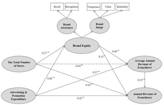 For the relationships between franchise marketing decisions and brand equity, the result for H1a shows that the number of total stores has a positive relationship with brand equity. This demonstrates that if there are more stores in operation, then it would be more likely for consumers to become exposed to the franchise brand and form brand images that are more specific and positive, which increases the level of brand equity. Similarly, advertising and promotion expenditures also contribute to building brand awareness and brand images, and ultimately brand equity (H1b). In particular, advertising and promotion expenditures have a greater influence on brand equity (β = 0.274) than the number of stores (β = 0.477). This is partly because advertising and promotion activities involve more direct efforts of franchisors to build or boost brand equity while influencing brand equity via increasing the number of stores in operation has a more subtle impact on consumers’ perception of brand awareness and brand image [52].