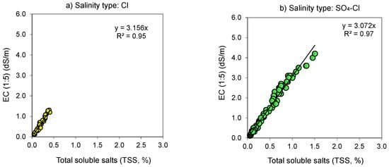 The EC of neutral (pH < 8.5) salinity types varied widely between 0.12 and 5.6 dS m−1 except for the Cl salinity type (Figure 2), yet it varied to a lesser extent, between 0.11 and 1.2 dS m−1, in the alkaline (pH > 8.5) salinity types (Figure 3). The fitted line presents the proportional relation (EC = a × TSS) between the two attributes, with a being the proportionality coefficient (Figure 2 and Figure 3). Because intersects of relationships were negligible, we opted to use the proportional type relation as it is easy to explore. Due to soil salinization–desalinization environmental processes, there were not enough available samples (e.g., locations) or just a limited number of samples exhibiting strongly saline (EC (1:5) = 1–2 dS m−1) and extremely saline (EC (1:5) > 2 dS m−1) levels from (i) neutral soils with easily washed Cl salinity type (Figure 2) and (ii) alkaline soils having SO4(Cl)–HCO3 and HCO3–SO4(Cl) type of salinity (Figure 3).
