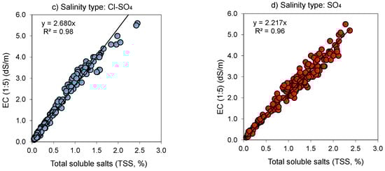 Relationship (p < 0.001) between the electrical conductivity (EC 1:5, dS m−1) and total soluble salt content (TSS, % or g salt/100 g soil) for 1:5 soil-to-water extract as affected by neutral (pH < 8.5) salinity type: (a) Chloride (Cl); (b) Sulfate–Chloride (SO4–Cl); (c) Chloride–Sulfate (Cl–SO4); and (d) Sulfate (SO4).
