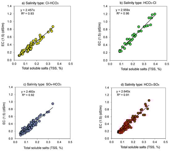 Relationship (p < 0.001) between the electrical conductivity (EC 1:5, dS m−1) and total soluble salt content (TSS, % or g salt/100 g soil) for 1:5 soil-to-water extract as affected by alkaline (pH > 8.5) salinity type: (a) Chloride–Soda (Cl–HCO3); (b) Soda–Chloride (HCO3–Cl); (c) Sulfate–Soda (SO4–HCO3); and (d) Soda–Sulfate (HCO3–SO4).