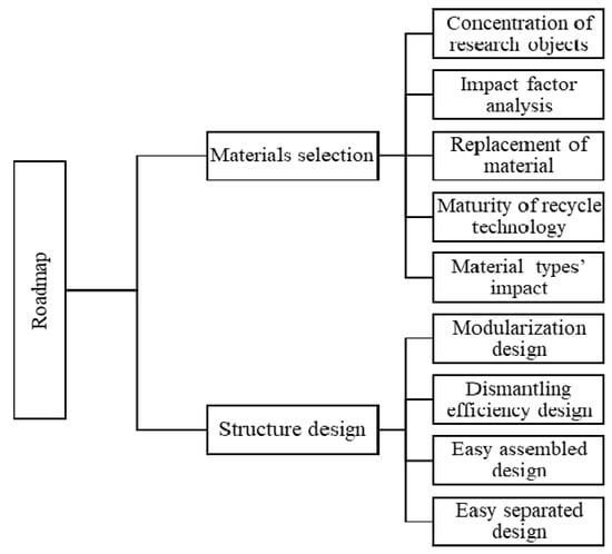 To find rational technical solutions that can maximize recyclability and recoverability, reduce the dependence on disassembly technology and recycling equipment in the later stage of vehicle scrapping, solve problems from the source, propose a management plan for huge material data information, and, ultimately, achieve the goal of minimizing waste landfill and maximizing secondary resource recycling with a minimal economic cost on the basis of relatively mature recycling technologies in China as well as in developed economies, such as Europe, the United States, Japan, and South Korea, by the optimization of vehicles’ material selection and structure design. This study focuses on maximizing scrapped vehicles’ recyclability and recoverability on the premise of meeting the requirements of relevant laws and regulations in China and other countries. In addition, the supervision of government management departments is also needed to ensure that manufacturers use suitable materials. The roadmap of this study is shown in Figure 1.