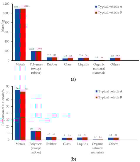 Material weight distribution (a) and material proportions (b) of typical vehicles A and B.