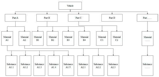 A vehicle is composed of many part assemblies. Each part assembly is composed of subcomponents or materials, and the material is composed of substances. This relationship is shown in Figure 3 as a tree structure. For example, part A is tire, then material A1 is chemical synthetic rubber, material A2 is natural rubber, substance A1.1 is petroleum, and substance A2.1 is rubber tree. Based on the analysis of materials of automotive components and parts, this paper focuses on improving scrapped vehicles’ recyclability and recoverability.