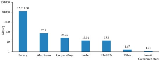 As shown in Figure 4, by analyzing configuration B as an example, the total lead content is 12,744.17 g, the lead content of the battery is 12,611.4 g, and the remaining Pb is mainly concentrated in aluminum, copper alloy, and solder, at about 116.3 g. 87.6% of the lead content comes from the battery. It is noticeable that the mass fraction of Pb, which is less than 0.1% devotes about 13.6 g. Aluminum and copper alloys used in mechanical processing are the main reasons for lead in engine shells. Lead can achieve a better demolding effect and ensure the relevant functionality of parts. Solder is an indispensable material in the welding process. By comparing and analyzing the requirements of banned substances for Chinese automobiles in GB/T30512 and the EU ELV Directive (2000/53/EC), it is found that lead is irreplaceably used in the materials, components, and parts covered by the exemptions of Article 2 (c), 3, and 5, and its substitutes are not expected to appear in the near future. Therefore, this paper focuses on the research of solders in electronic and electrical appliances, which is the main source of lead.