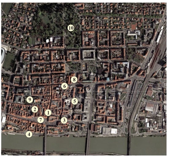 Spatial arrangement of selected study sites (orthophoto map: Geopedija, 2020). Legend: 1(Gosposka Street), 2 (Poštna Street) 3 (Kneza Koclja Street), 4 (Lent), 5 (Leon Štukelj Square), 6 (Castle Square), 7 (Main Square), 8 (Liberty Square), 9 (Slomšek Square) in 10 (City Park Maribor).