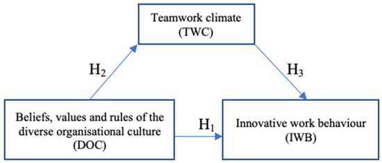 | Beliefs, Values, and Rules of a Diverse Organizational Culture—(DOC) | Climate in Teamwork (TWC): Perceived Quality of Cooperation among Staff | Innovative Work Behavior (IWB) |