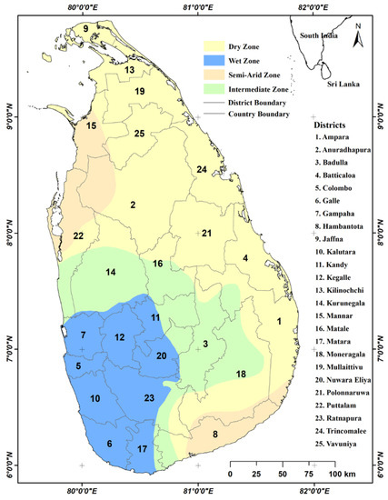 Sri Lanka is an agricultural island in nature with a tropical climate, located in the southwestern part of the Indian Ocean and below India at latitudes 5–10° N and longitudes 79–82° E (Figure 1). Sri Lanka covers 65,610 km2 and has a coastline of 1340 km, with a population of 22 million. Moreover, Sri Lanka is divided into four climatic zone, wet zone (>2500 mm), dry zone (1800–2500 mm), intermediate zone (1200–1800 mm), and semiarid zone (<1200 mm), categorized using the average of long-term annual rainfall [60]. Moreover, there are four rainfall seasons (monsoon seasons) identified in Sri Lanka that directly affect the annual rainfall, namely northeast monsoon (NEM—December to February), first inter-monsoon (FIM—March to April), southwest monsoon (SWM—May to September), and the second inter-monsoon (SIM—October to November) [61]. According to these four tropical rainy seasons, in Sri Lanka, two cultivation seasons, known as “Yala” and “Maha,” can be identified. Yala season is from April to September, and Maha season is from October to March next year [62]. Sri Lanka is one of the most affected countries, in terms of the percentage of the population affected by various natural disasters, and is ranked second among the affected countries in the Global Climate Risk Index published in 2019 [63]. Furthermore, drought is one of the most severe natural disasters affecting agriculture in Sri Lanka and has affected various parts of the country in different intensities.
