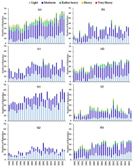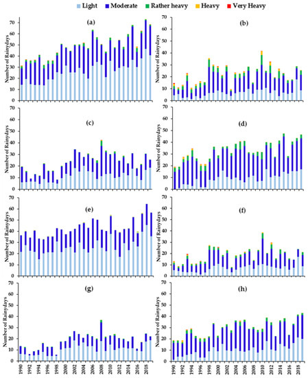 Mean number of rainy days exceeding the reported daily rainfall threshold level; bars and lines represent the number of rainy days in the classes defined in Table 1. The average number of rainy days in the wet zone (a–d) during southwest monsoon (SWM), northeast monsoon (NEM), first inter-monsoon (FIM), and second inter-monsoon (SIM), respectively, and (e–h) dry zone during SWM, NEM, FIM, and SIM, respectively.