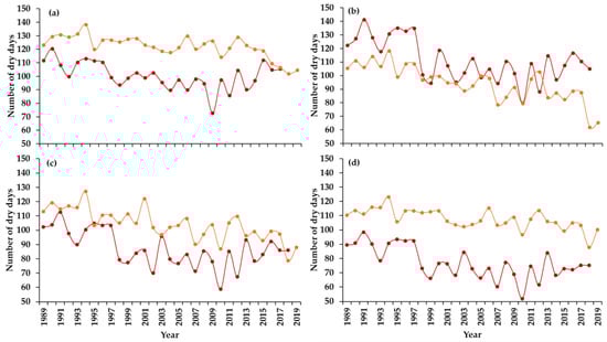 Figure 5 shows the variation of dry days in the wet, dry, intermediate, and semiarid zones during the Yala and Maha cropping seasons from 1989 to 2019. The most important thing that emerges here is the tendency for an apparent decrease in the number of non-rainy days from 1990 to 2019 for all the climatic zones.