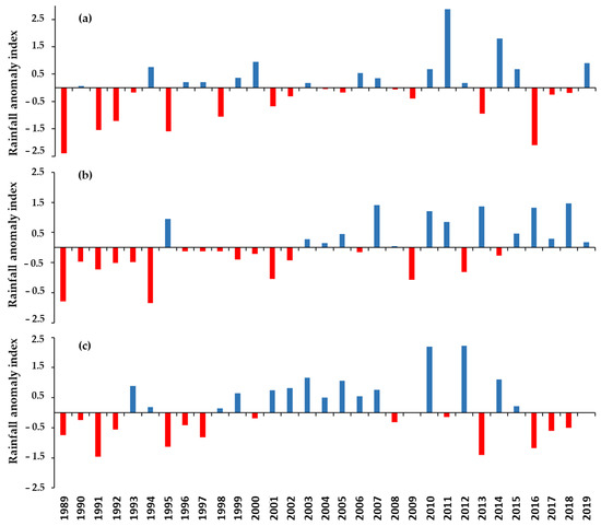 (a) Annual, (b) Yala, and (c) Maha season rainfall anomaly index from 1989 to 2019 in Sri Lanka.
