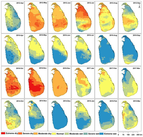SPI is a drought index widely used by decision-makers worldwide to identify, monitor, and determine droughts’ severity. In this study, the SPI values at the district level in Sri Lanka were calculated for 3, 6, 9, 12, and 24 months from 1989 to 2019, as this index is designed to determine the meteorological drought for such different time scales. Soil moisture and crop health generally respond to short-term and small-scale rainfall changes, while long-term rainfall changes are reflected by changes in groundwater runoff and reservoir storage.