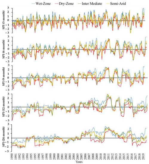 Figure 8 shows the 3, 6, 9, 12, and 24-month SPI values for the wet, intermediate, dry, and semiarid zones of Sri Lanka from 1989 to 2019, respectively. An important point to note from all the SPI analyses described above is that droughts’ intensity in the dry zone is much higher than in the wet zone. This reflects well for the chronological variability of short- and long-term droughts. During the last 31 (1989 to 2019) years, which is the study period of this research, drought has been reported from various parts of Sri Lanka in the years 1989, 1992, 1996, 2000, 2001, 2002, 2004, 2009, 2012, 2013, 2014, 2016, 2017, and 2018, respectively as reported in various studies [12,14,77]. The SPI depicted in Figure 8 has captured well all the droughts mentioned above in most of the studied SPI time intervals.