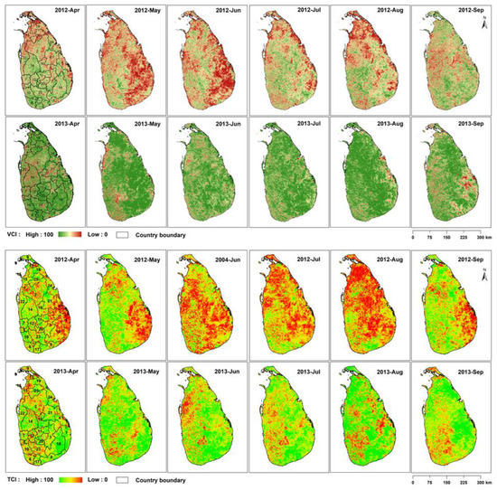 In order to determine the relationship between meteorology and agricultural drought, the NDVI, LST, VCI, TCI, and VHI indices were analyzed as described herein. Variations in VCI and TCI were studied, assuming that most vegetation was stressed during the drought years and average in other years. A continuous decrease in the values of VCI and TCI or the longevity of low values is suitable for demonstrating dryness or crop stress level in a country, region, province, district, or a pixel of a satellite image. Figure 9 shows the VCI and TCI indices’ spatial and temporal variability during the Yala (April to September) seasons of the drought year of 2012 and non-drought year of 2013.