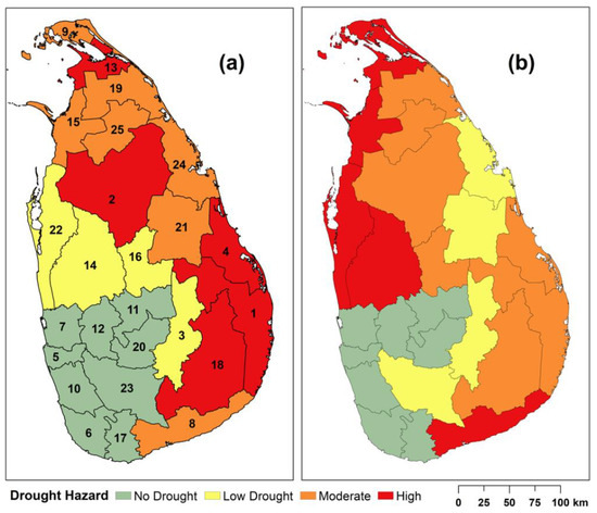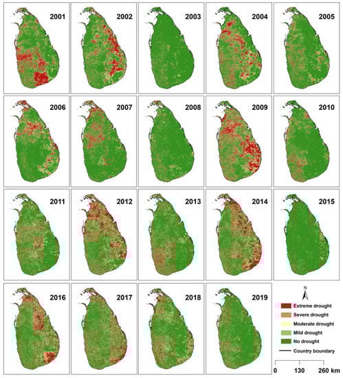 Although Sri Lanka is a tropical country, it has been hit by many extreme to severe droughts over the past few decades, and their adverse effects have severely affected the country’s economy [11,12]. According to various studies and reports, there were 14 drought events that had been recorded during the period from 1980 to 2019 in Sri Lanka [13,14,15]. Moreover, about 52% of crop damage from 1974 to 2013 was caused by drought, alone [12]. The droughts recorded during 2001, 2002, 2016, and 2017 were of great concern to Sri Lanka [12,15]. A continuous drought reported in 2001 and 2002 severely affected the country’s hydropower generation and agriculture sector, reducing its GDP by about 1% [12]. Therefore, identifying drought-prone areas through the study of the occurrence and spatial distribution of historical droughts in Sri Lanka would be of utmost importance in selecting drought mitigation measures to reduce the future drought risk.