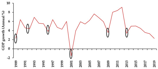 - World Bank Open Data, GDP Growth (Annual %)—Sri Lanka (1965–2019). Available online: https://data.worldbank.org/indicator/NY.GDP.MKTP.KD.ZG?locations=LK (accessed on 10 January 2021).