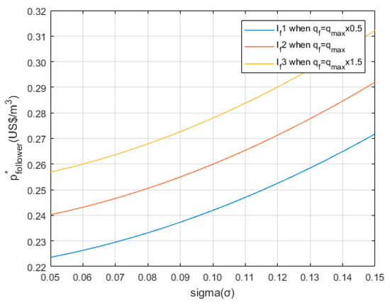 We now perform the sensitivity analysis of the investment threshold price over the range of the variables. Figure 2 shows the sensitivity of the threshold water price (p*f) with respect to the volatility (σ) and the investment cost of follower (If). While an increase in both σ and If increases p*f, Figure 2 shows that p*f is more sensitive to the initial investment cost If than the uncertainty σ.