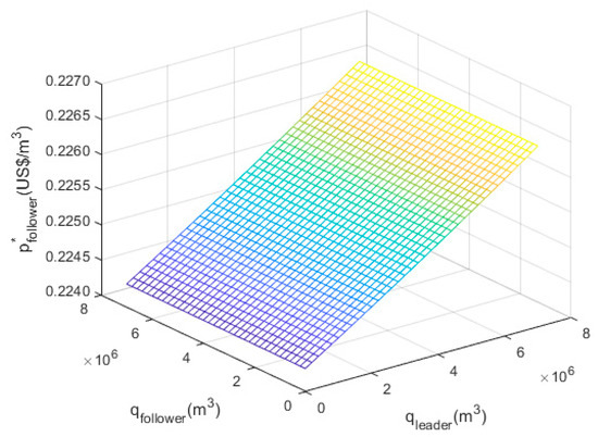 Figure 3 shows the effects of the groundwater extraction of the leader (ql1) and the follower (qf) on the threshold water price of the follower (p*f). p*f increases as ql1 and qf increases, and is more responsive to ql1 compared with qf. It implies that the leader can defer the entry of the follower by increasing ql1 and therefore increasing p*f, which enables the leader to collect monopolistic profits until the follower enters into the market.