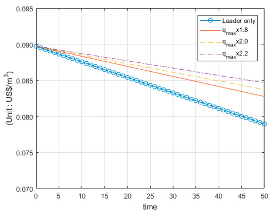 Using the parameter values in Table 1, the threshold water price is calculated for three scenarios, the follower’s groundwater extraction is set as (i) 80% of qmax, (ii) equal to qmax, and (iii) 120% of qmax. The scenarios allow us to investigate the optimal extraction of the leader (ql) in response to the possible investment scale of the follower. The scenarios also analyze the threshold water prices corresponding to the investment scale.