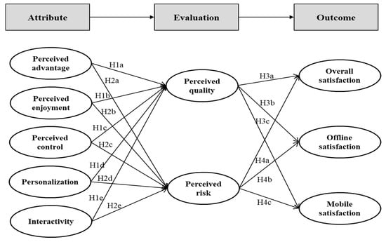 Conversely, perceived risk, which differs from objective risk, is defined as the degree to which consumers perceive the dangers in the process of use, and the degree of anxiety they feel about unexpected results that may occur when purchasing or using a product [83]. Thus, perceived risk is the overall assessment of the uncertainty and negative consequences of a retail experience [84]. Perceived risk depends on the likelihood of negative consequences arising from using a product or service and the severity of losses such consequences may cause [85]. Previous studies have indicated that perceived risk increases with new products, higher prices, technical complexity, and lack of experience or confidence in use [86,87]. If risk is perceived in relation to a technology-based, offline−mobile connected smart retailing experience, it is expected that this would lead to negative consumer evaluations and reduced satisfaction. In this study, we assumed that the perceived quality of the offline-mobile connected smart retailing experience would constitute a positive effect on overall satisfaction, as well as offline and mobile satisfaction, while perceived risk would have a negative effect. Accordingly, the following hypotheses were established: