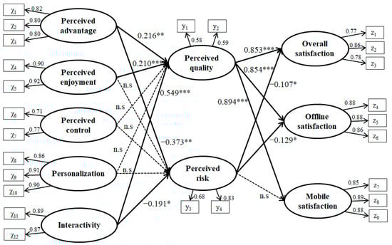 Next, perceived quality was found to have a positive effect on overall satisfaction (β = 0.853 ***), offline satisfaction (β = 0.854 ***), and mobile satisfaction (β = 0.894 ***); thus, H3a, H3b, and H3c were supported. Perceived risk negatively affected overall satisfaction (β = −0.107 *) and offline satisfaction (β = −0.129 *). Therefore, H4a and H4b were supported, but H4c was rejected, as perceived risk did not affect mobile satisfaction. Perceived quality was found to have a significant influence on satisfaction, but perceived risk did not significantly affect mobile satisfaction. As it was a mobile-mediated experience in an offline store, even in an offline−mobile connected experience, consumers may have considered overall and offline satisfaction to be more important than mobile satisfaction.