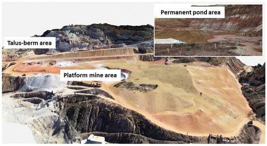 General view of the main three areas to be restored (i.e., platform mine area, talus-berm area, permanent pond area), obtained after geomorphological modeling. The Geofluv™ method was performed in the platform mine area, the talus-berm technique was applied due to the presence of steep slopes in the area, and no modeling was carried out in the pond area.