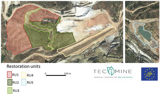 According to these characteristics, three restoration units (RUs) were identified in the platform mine area: RU1, the steepest area with slopes ranging from 15% to 30% whose aspect went from northwest to north; RU2, the flattest area with slopes ranging from 0% to 15%, dominated by north-facing slopes; RU3, mainly in the bottom part, which constituted the drainage channel. The constituted talus-berm area (RU4), which covered approximately 0.1 ha and was located on very steep adjacent surfaces next to the platform mine area (Figure 4; left). In this unit, geomorphological remodeling consisted of systems with flat “berm” areas and steep slopes above 30%. Finally, the permanent pond area (RU5), covering ca. 0.4 ha, resulted in a seminatural wetland area (Figure 4; right) to which no geomorphological restoration was applied.