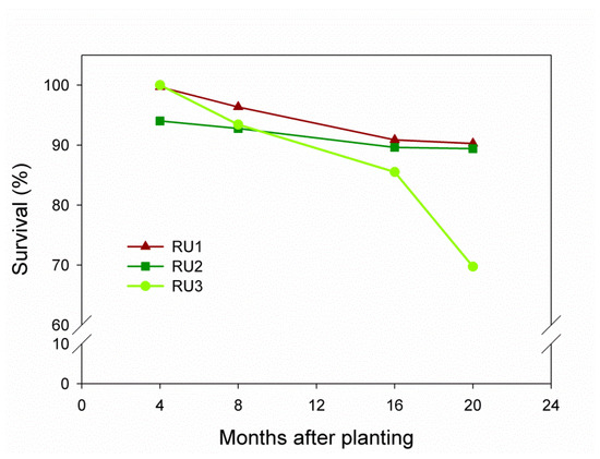 Species survival dynamics (%) 20 months after planting for each restoration unit. Red line with triangles represents RU1, the dark green line with squares represents RU2 and light green line with circles represents RU3. Dates go from 19 March to 20 November.