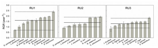 Relative growth rates (RGR) in plant height for each species (mean ± SE). Values are represented by gray vertical bars and organized by restoration units: RU1 (left plot), RU2 (middle plot), RU3 (right plot). The mean values of each RU are represented by solid lines, and the maximum and minimum values by dotted lines. RGR was calculated as the difference between the ln-transformed values of the total plant height for the study period (from July 2019 to September 2020) and the difference of time is expressed in years (year-1).