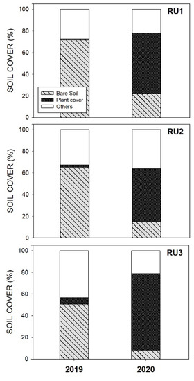 Soil cover (%) in the different restoration units (RU1, RU2, RU3) for Spring 2019 and Spring 2020. Different colors and textures were assigned to the various cover categories. Bare soil is shown in grey with lines, Plant cover in dark gray and, Others in white. Others refers to different categories such as stones, blocks, compost and litter.