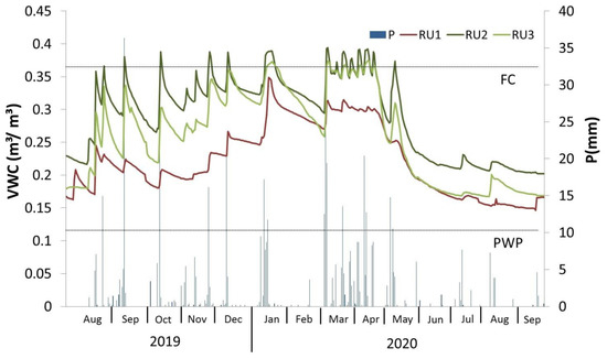 Volumetric water content (VWC) of soils on a daily basis for the different restoration units (RU, RU2, RU3) (left axis). The vertical blue bars represent the precipitation values recorded by the meteorological station installed in the TECMINE area (right axes). Field capacity (FC) and permanent wilting point (PWP) values (dotted lines). Data are shown from 19 August to 20 September.