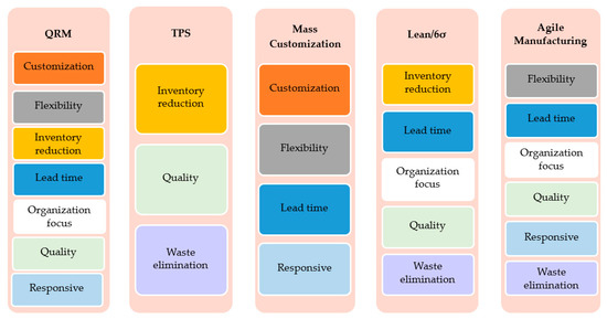 During the last few years, flexible and cycle time-focused scheduling strategies have attained much attention for their potential to maximize profit in production-based industries. In this context, Suri (2010) [1] introduced quick response manufacturing (QRM) to gain a competitive advantage by tracking faster product deliveries, especially in the case of high product variety. The primary objective of most lean manufacturing tools does not reduce lead time, whereas the QRM philosophy directly emphasizes lead time reduction. QRM is a company-wide strategy that pursues increasing the throughput by reducing the lead times across all operations, covering all aspects of manufacturing, design, planning and control, and supply management. Thus, the QRM approach works on transforming the company into a fully integrated cellular organization. The QRM approach has offered a promising manufacturing paradigm. In the last few years, several companies have implemented QRM strategies and achieved excellent results (Jitpaiboon et al., 2016 [2]; Suri and Rath 2002 [3]). The important outcomes were a reduction in lead times (80–95%), reduction in product cost (15–50%), improved delivery performance (from 40% to 98%), and waste reduction in the form of scrap and rework (more than 80%). A comparison of QRM with the preceding manufacturing and production approaches is presented in Figure 1. From the manufacturing paradigms, QRM appears to be best suited for companies that are involved in Engineer-to-Order (ETO) products [4]. Figure 1 explains that QRM has very much in common with the lean production paradigm [5,6,7], for instance, cross-functional teams, on-demand assembly [8,9], and quality systems. Likewise, QRM also covers all aspects of mass customization [10], agile manufacturing [11], and Toyota production system (TPS) [12] approaches, except for waste elimination. As shown in Figure 1, besides the other performance parameters, QRM mainly emphasizes reducing the lead time.
