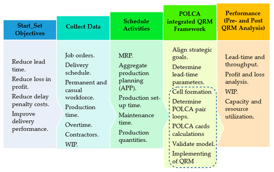 A precision parts manufacturing industry in Pakistan that is dealing with ETO products was targeted. The company manufactures a wide variety of highly precise electronic components with tight delivery schedules. Numerous state-of-the-art technologies along with advanced automation system applications are the main strengths of the company. Currently, the organization is using the Push/MRP scheduling system for the management of all development, production, and after-sales service activities. However, due to the high variety of products and a very tight delivery schedule, the development and delivery schedule needs frequent adjustment. According to the statistical estimates, 55% of the company products are not delivered on time to customers, which results in a total financial loss of USD 2.08 Million per year. The company is striving to overcome this loss in profit by analyzing the existing delays in terms of overtime, warranty claims, and outsourcing at a higher cost, etc. To investigate the prospects and advantages of POLCA integrated QRM strategy in the company, a framework was developed and executed considering the strengths and limitations of the selected manufacturing setup. This is explained in Figure 4. MRP scheduling is a prerequisite for implementing QRM. It is also important to set realistic performance indicators, i.e., reducing the lead time by considering demand and delivery.