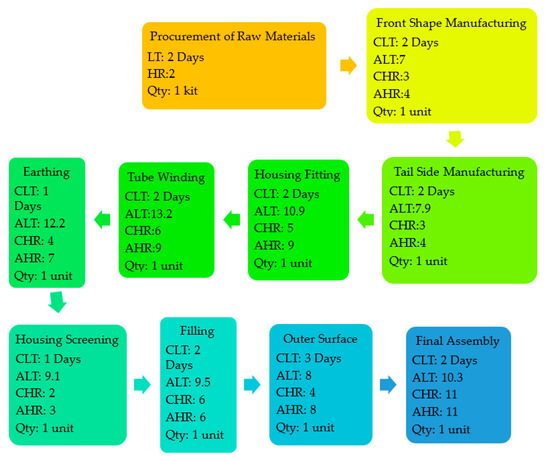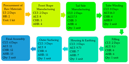 As explained earlier in Section 1, QRM focuses on the reduction of work in process (WIP) and helps with managerial decisions to obtain the targets on the set lead time. In this study, the analysis was carried out considering the major indicators as production lead time, average delivery time, average WIP, and total loss in monetary value of the concerned products.
