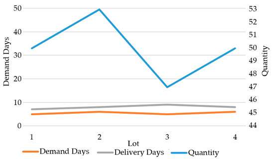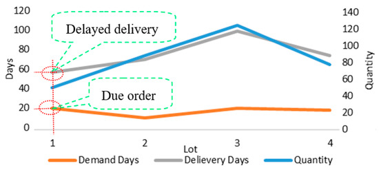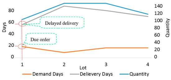 The current demand and delivery schedule for product B is shown in Figure 8. Figure 8 shows the variation in the actual and calculated delivery dates.