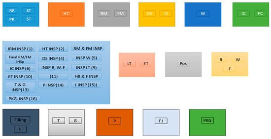 A cellular layout was proposed in which similar processes are grouped together in a cell. For example, the inspection activity taking place after every process can be grouped together as a central inspection and storage cell. The abbreviations of the operations involved in the manufacturing of different products by the company are detailed in Table 7. The cell formation was based on the ranked clustering technique (ROC). The cells formed after applying ROC are presented in Table A1 (Appendix A), given in the Appendix A. For a better understanding, the optimized cell formation is shown in Figure 9.