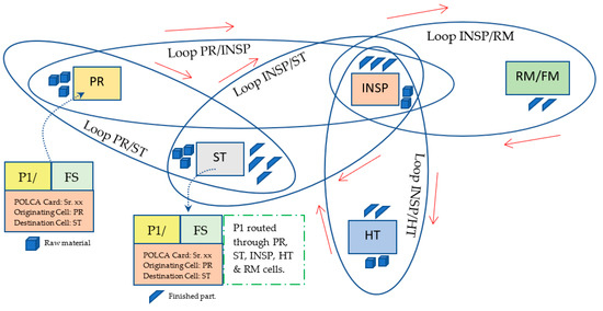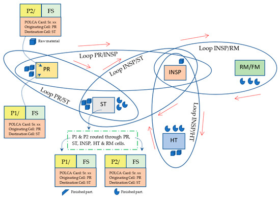 POLCA is currently gaining a great deal of attention in industrial production control systems for high-mix, low-volume, and custom-made products. POLCA stands for paired cell overlapping loops of cards with authorization. QRM supports the use of POLCA card systems, which is a hybrid push-pull strategy used between cells to reduce lead times. To implement POLCA we need a cellular layout [32,33] and HL/MRP (High Level/Material Requirements Planning) scheduling [34,35], or we can say that they are the prerequisites for implementing POLCA. POLCA uses two cards, unlike Kanban, which only uses one card and neglects whether the downstream station has the available capacity free or not. The card priority is set according to the customers’ order delivery targets, so the upstream operations are forced to their maximum capacities to meet the demands of downstream operations. Since the production is oriented to the customers’ orders, it prevents undue work-in-process (WIP), which results in no unexpected bottlenecks [36]. The main strength of POLCA is that it does not involve complex formulation or simulations and can be integrated with existing MRP and ERP (Enterprise Resource Planning) systems [37,38].