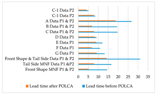 This means that one POLCA card is needed to meet the demand of 518 products in five days and 518 bins. However, considering a greater lead time for a product, more POLCA cards are to be floated in the streamlined operations (referring to Figure 3, QRM has a margin of 20% unutilized production), keeping in view the available resources and customer delivery dates. The calculations of POLCA cards based on the lead time of product A are shown in Table 8. The total actual lead time for the manufacturing of the front shape of product 1 (P1) is 7 days. The allocated lead time provides us an estimate of how much we reduced our lead time, which was 4.73 days.